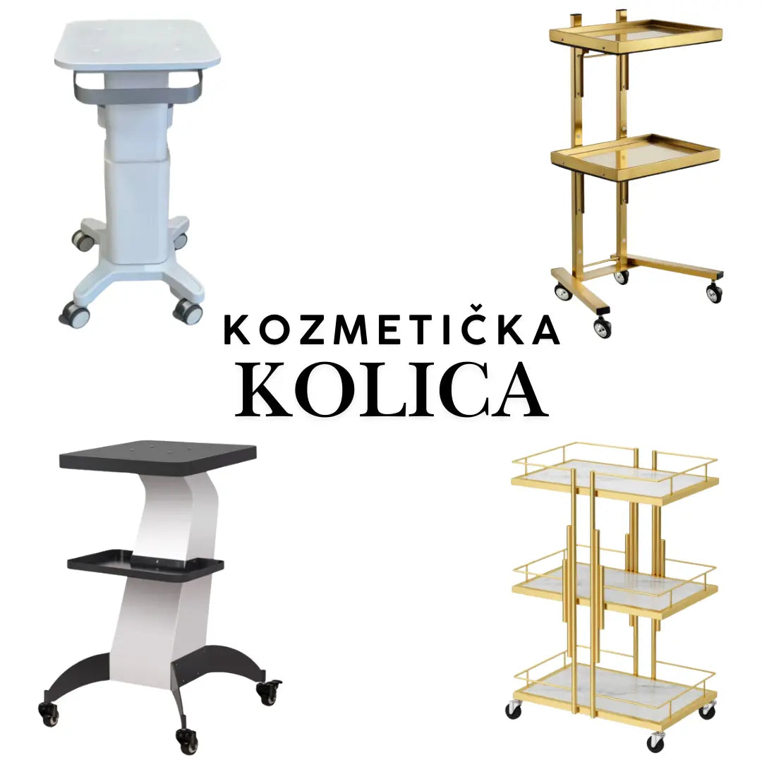 Stranica prikazuje kolekciju kozmetičkih kolica i profesionalnih kolica za salon – praktičnih, mobilnih radnih stanica dizajniranih za organizaciju opreme i alata u kozmetičkim, frizerskim i SPA prostorijama. U ponudi su različiti modeli kolica sa više nivoa polica, zlatnim i modernim dizajnom, točkićima za lako pomeranje i stabilnom konstrukcijom, prilagođeni za svakodnevnu upotrebu u profesionalnom okruženju